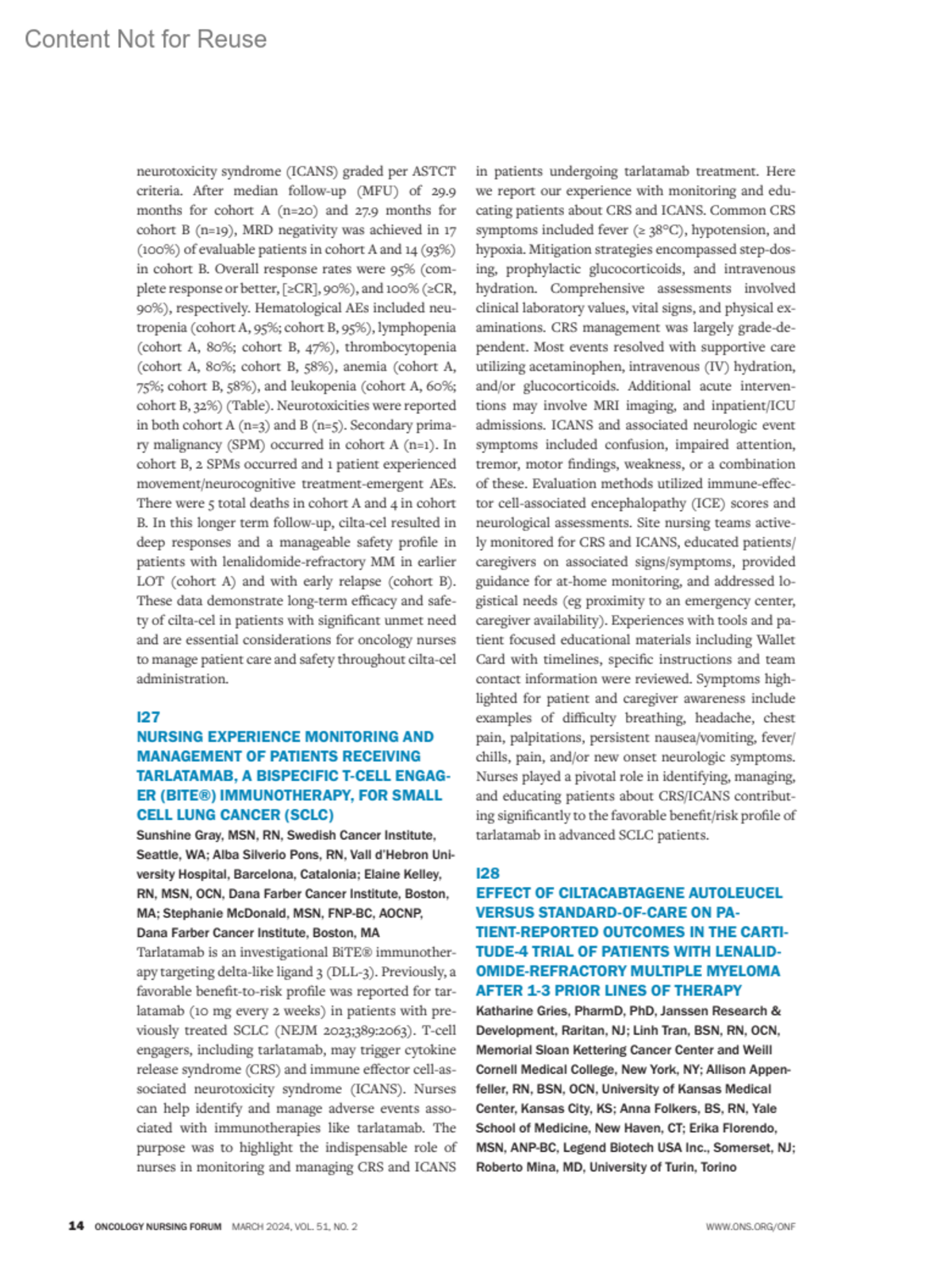 NURSING EXPERIENCE MONITORING AND MANAGEMENT OF PATIENTS RECEIVING TARLATAMAB, A BISPECIFIC T-CELL ENGAGER (BITE®) IMMUNOTHERAPY, FOR SMALL CELL LUNG CANCER (SCLC)