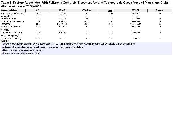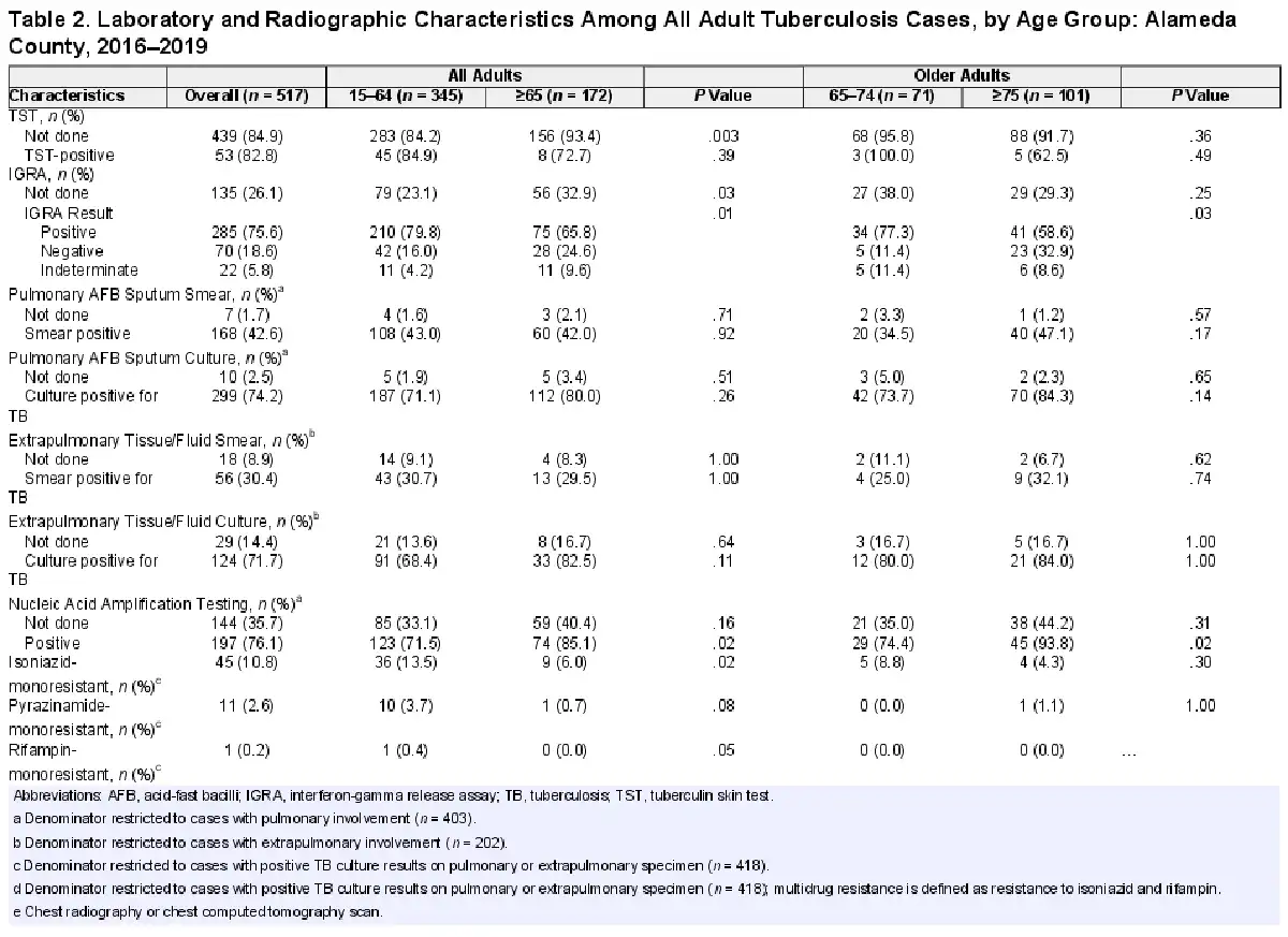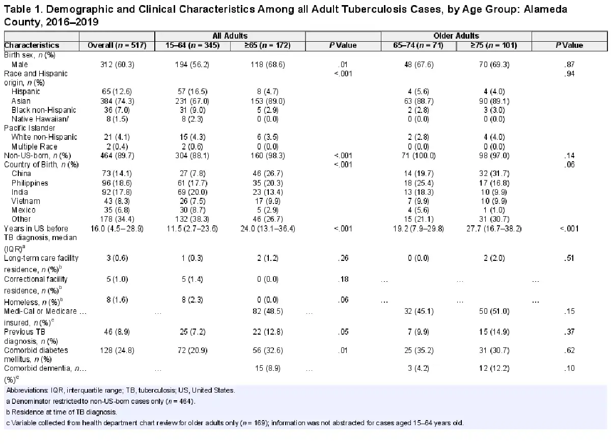These analyses are subject to several limitations. First, our data were derived from TB cases in Alameda County where the racial and ethnic population distribution may differ from other regions. Tuberculosis-complicating conditions such as diabetes may also have a different prevalence in this county compared to other regions of California or the United States. However, Alameda County has a high non-US-born population and encompasses a diverse range of urban and rural settings, potentially increasing the generalizability of our findings to other settings where TB is relevant. Second, our 3-year study period provides a recent snapshot of TB disease, but, notably, before the coronavirus disease-2019 (COVID-19) pandemic. Although additional factors may need to be considered during this period, we were still able to capture key aspects of TB disease in older adults that would most likely be exacerbated during the COVID-19 pandemic []. Third, our analyses were restricted to data available in our surveillance system and public health charts. As a result, we may not have identified all comorbidities or non-TB medications in the medical chart. We also could not definitively determine whether delays in diagnoses were due to provider or patient factors, and, as mentioned, we could not definitively attribute deaths to TB disease.