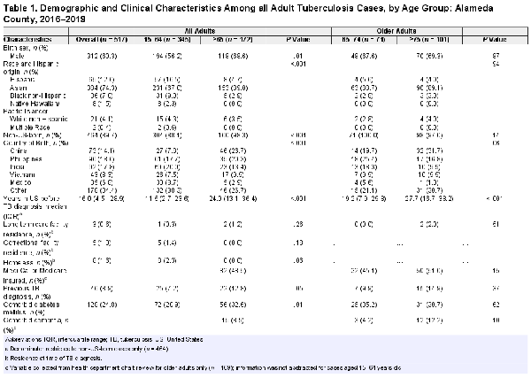 In a large county in Northern California, we utilized both surveillance and public health case management chart data to investigate the clinical, diagnostic, and treatment outcomes of older adults to guide interventions to improve TB care for older adults.