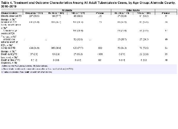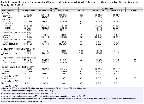During January 1, 2016—December 31, 2019, a total of 517 adult TB cases were reported in Alameda County. Of these adult TB cases, 172 (33.3%) occurred among adults aged 65 years and older. Of the 172 older adults, 169 (98.3%) public health case management charts were available for review. Three individuals aged 65 and older did not have accessible public health case management charts and were excluded from those analyses.