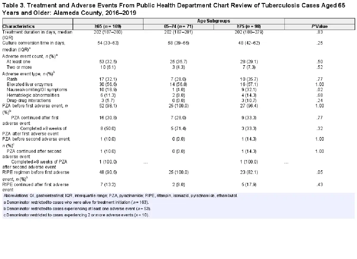 Tuberculosis treatment regimens and duration were comparable between younger and older adults. Some clinicians have voiced concerns over using PZA-containing regimens in older adults because of potential adverse events, such as hepatotoxicity [, ]. However, many studies have shown that avoidance of PZA-containing regimens is associated with higher rates of treatment failure [], higher mortality [], and longer time to TB culture conversion []. Current US TB treatment guidelines recommend weighing treatment options on a case-by-case basis, taking into consideration individual disease characteristics, comorbidities, and potential drug interactions []. Our findings support this recommendation, because age alone did not appear to be associated with a different prevalence of PZA-related adverse events. Among those older adults who had adverse events and were rechallenged with PZA, half were able to tolerate treatment for 8 weeks. This finding has important implications because individuals who tolerate an 8-week course of PZA can have an overall shorter treatment course compared to those on non-PZA regimens. In line with current US guidance, comorbidity burden and other complicating disease characteristics, rather than age, may be more valuable in guiding the choice of a TB regimen and predicting treatment outcomes.