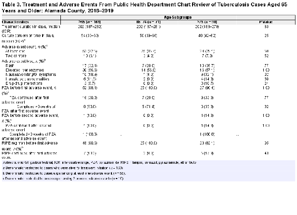 The ACPHD public health case management charts for all older adult TB cases aged 65 years and older within this timeframe were reviewed. Insurance information, clinical characteristics, and treatment outcomes not already present in the RVCT form were abstracted. Presence of specific comorbidities was noted, as well as the number and type of non-TB medications being taken by each patient. Adverse clinical events were characterized by symptom type, duration, and medication regimen before and after each event.
