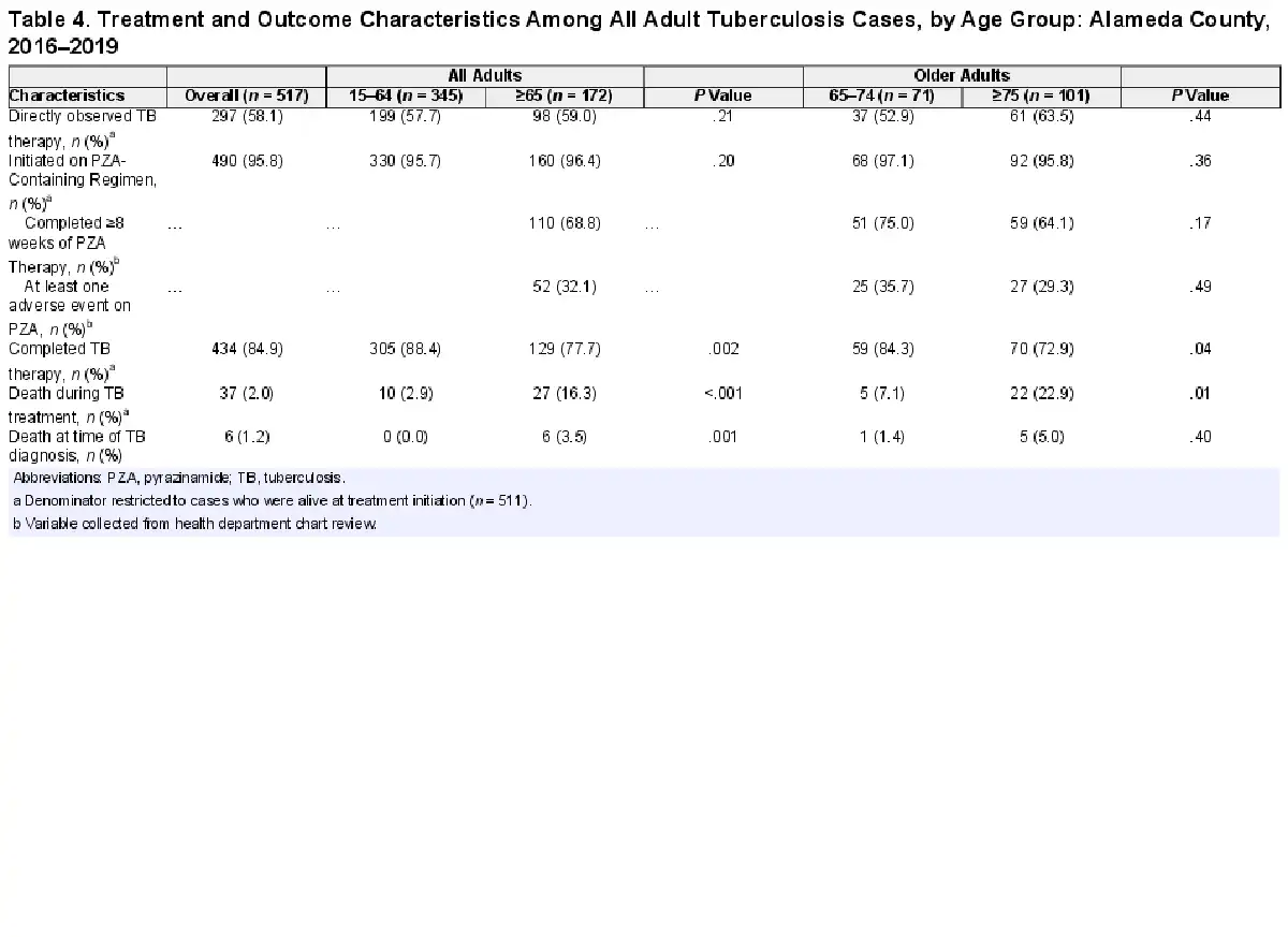 Adults aged 65 years and older (older adults) represent an increasing proportion of tuberculosis (TB) cases in the United States. Since 2017, older adults have comprised over one quarter of all US TB cases while representing only 16% of the population []. The demographic shift in TB cases toward older individuals has created new challenges to TB diagnosis and management []. Tuberculosis signs and symptoms such as fever, cough, lymphadenopathy, and weight loss overlap with other diseases in this age group including chronic lung diseases and malignancy. Older adults are also less likely than younger adults (15–64 years old) to be identified in contact investigation studies because fewer than 5% of cases are due to recent transmission [, ]. Furthermore, older adults are more likely to have comorbidities than younger adults and take multiple medications that may interact with anti-TB treatment []. With these challenges, the few studies on TB among older adults suggest that they have worse treatment outcomes than younger adults [, ]. Limitations of these studies are that they did not have greater detail on comorbidities, treatment characteristics, and outcomes because they relied on public health surveillance data.