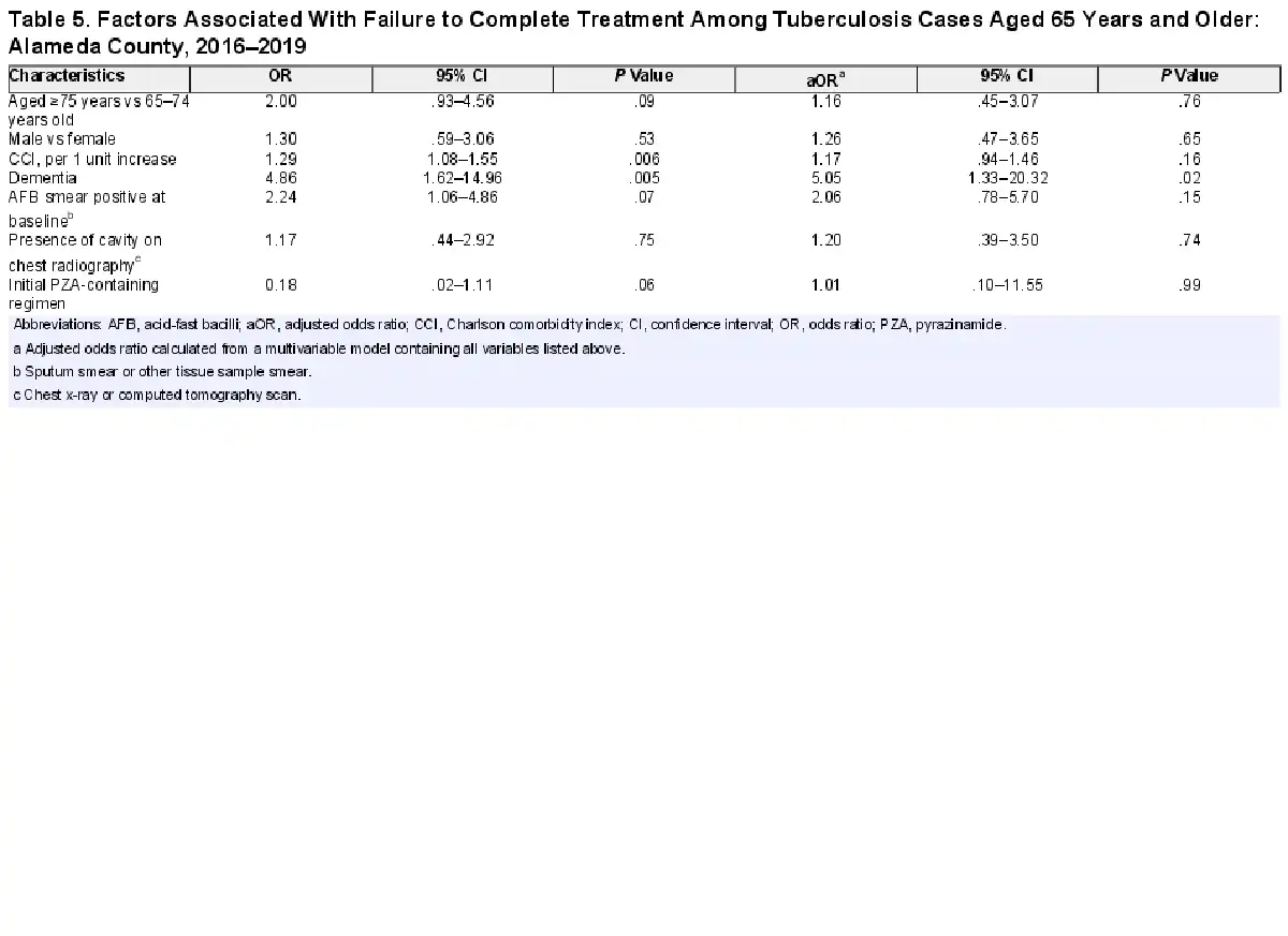 The multivariable model was constructed using data from individuals who were aged 65 years and older, were alive at diagnosis, and had public health chart data available (n = 163). On bivariate analysis, aged 75 years and older, dementia, CCI, and positive AFB sputum smear at baseline were associated with increased odds of treatment noncompletion (Table 5). Initiation on a PZA-containing regimen was protective against treatment noncompletion in bivariate analyses (odds ratio [OR] = 0.18; 95% confidence interval [CI], .02–1.11; P = .06). In the adjusted model, dementia was significantly associated with treatment noncompletion (adjusted OR = 5.05; 95% CI, 1.33–20.32; P = .02). Collinearity between the variables in the multivariable model was insignificant, with all variance inflation factors <1.20.