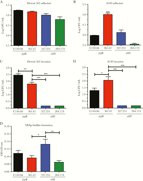 PspK is an adhesin that aids in adherence to host cells, and AliC and AliD are oligopeptide binding proteins that sense the extracellular environment []. We grouped isolates based on expression of PspK or AliD to examine virulence mechanisms. Human pharyngeal and pulmonary epithelial cells were used to mimic the host niche during colonization and pneumonia (Figure 1). All clinical isolates efficiently adhered to pharyngeal cells (Figure 1A). PspK-expressing 361.67 adhered to A549 pulmonary cells significantly more (P < .001) than all other isolates (Figure 1B). PspK-expressing cells invaded both pharyngeal and pulmonary cells significantly more (P < .001) than their AliD-expressing counterparts (Figure 1C and D). When comparing epithelial cell invasion by PspK-expressing strains C144.66 and 361.67, C144.66 demonstrated significantly greater (P < .01) invasion of pharyngeal cells (Figure 1C), whereas 361.67 demonstrated significantly greater (P < .05) invasion of pulmonary cells (Figure 1D). All NESp strains formed dense biofilms (Figure 1D), but the AliD-expressing strain 327.251 formed significantly more biofilm than the other pulmonary isolates 361.67 (P < .05) and 264.174 (P < .01).