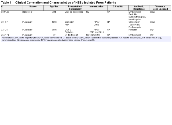In this report, we determined that nearly 9% of pneumococcal infections at UMMC were linked to NESp, and we described 3 patients who develop NESp-associated pneumonia. We also demonstrated that NESp express antibiotic-resistant phenotypes that threaten classical treatment measures. As there are no currently licensed NESp preventatives, antibiotic-resistant NESp are an emerging threat to public health. To better understand how NESp are able to establish disease, we examined virulence mechanisms of the clinical isolates. All NESp isolates efficiently adhered to pharyngeal cells and formed dense biofilms, which likely aided in nasopharyngeal colonization and development of pneumonia. NESp did not invade epithelial cells efficiently, which suggests that NESp are able to withstand the extracellular environment despite the lack of a protective polysaccharide capsule.