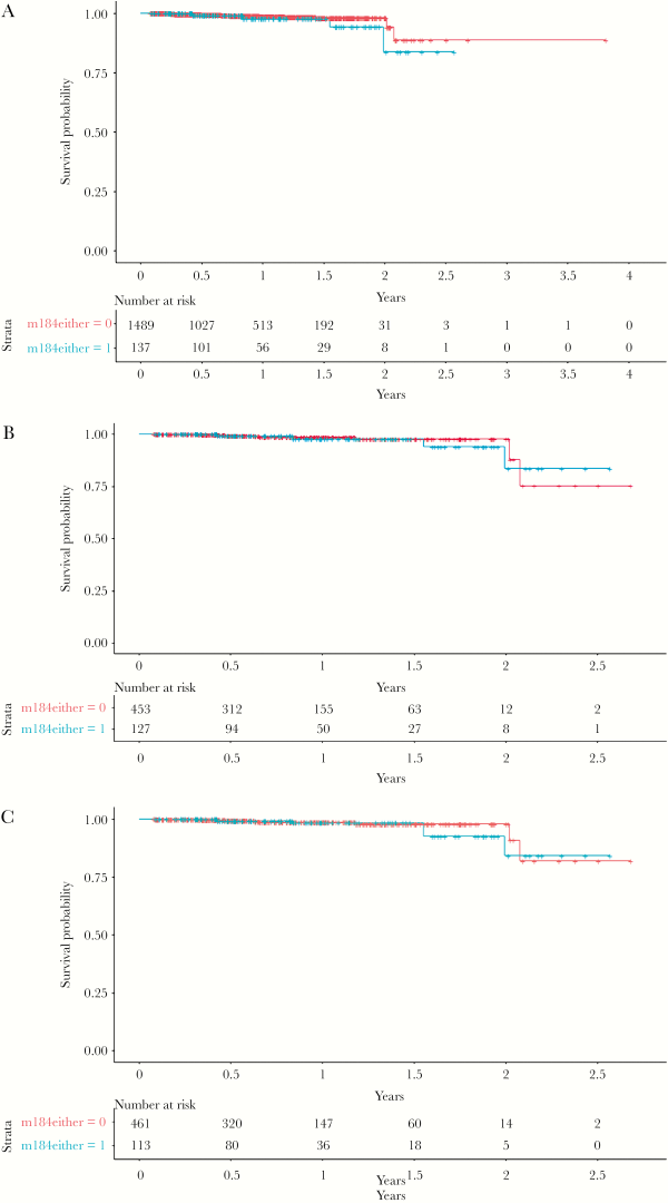 In the univariate Cox proportional-hazards analyses, the presence of the M184V/I mutation was not significantly associated with a higher risk of failure (hazard ratio [HR], 1.81; 95% confidence interval [CI], 0.60–5.49; P = .29; Figure 1A).