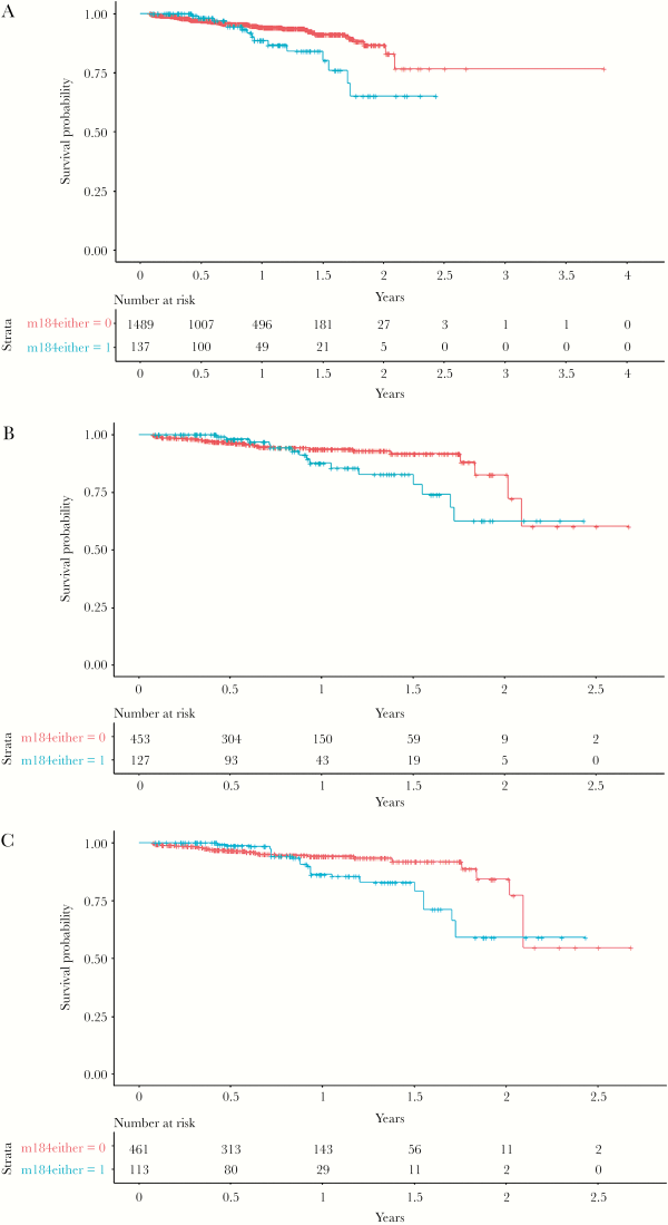 The unweighted univariate analysis showed that M184V/I had an effect on the increase of the risk of the composite outcome (HR, 1.92; 95% CI, 1.09–3.35; P = .022; Figure 2A). However, the propensity score on the total study population was not statistically significant (HR, 1.66; 95% CI, 0.93–2.96).