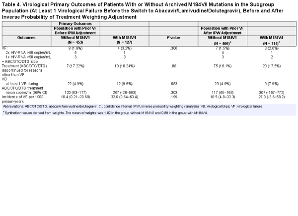 Table 4. Virological Primary Outcomes of Patients With or Without Archived M184V/I Mutations in the Subgroup Population (At Least 1 Virological Failure Before the Switch to Abacavir/Lamivudine/Dolutegravir), Before and After Inverse Probability of Treatment Weighting Adjustment