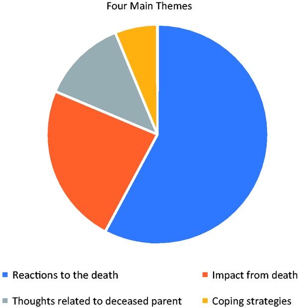 Specifically, reactions to death was divided into physical (28), psychological (40), and behavioral (25). Psychological reactions were then further split into anxiety or depression (14) and everything else (26). Impact of death was also divided into impact on school (22) and impact on family (16). In the third category, thoughts related to the deceased, bond continuation (10) was separated as a distinct theme from thoughts related to the deceased (10). Finally, the most commonly cited needs category has a total of 10 codes. The details of this coding distribution are summarized in Figure 2.