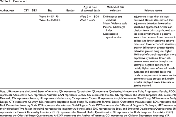 Sources enlisted in Table 1 describes the final selected articles pertaining only to adolescent bereavement. Since this current review includes studies on parental death during adolescence only, all studies of adolescent bereavement that included other types of death, other than parental death, were excluded from this review. Mixed studies with adult/adolescent participants were also excluded.