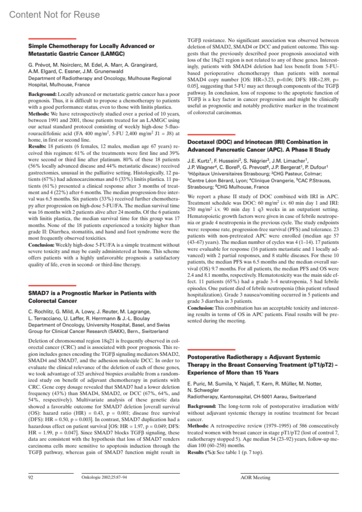 SMAD7 is a Prognostic Marker in Patients with Colorectal CancerRochlitz, C.Mild, G.Lowy, A.Reuter, J.Lagrange, M.Terracciano, L.Laffer, U.Herrmann, R.Boulay, J.-L.Author informationDepartment of Oncology, University Hospital, Basel, and Swiss Group for Clinical Cancer Research (SAKK), Bern., SwitzerlandOnkologie 25(1):p 92, February 2002.Copyright © 2002 S. Karger AG, Basel