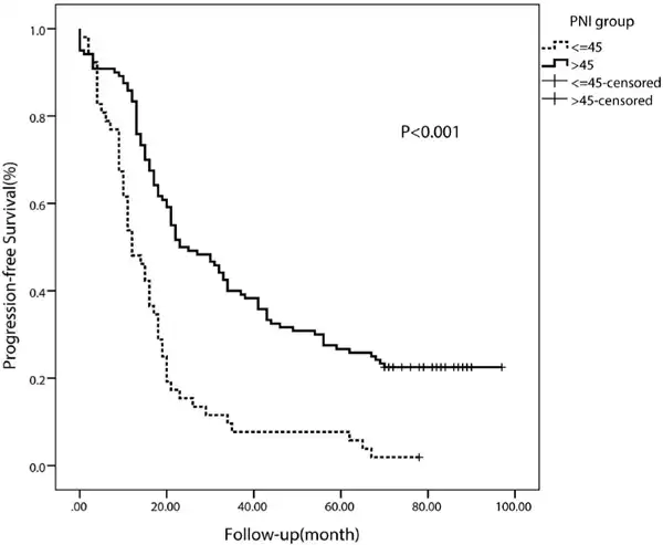 Kaplan-Meier curve for progression-free survival regarding low versus high prognostic nutritional index (PNI) (p < 0.001).