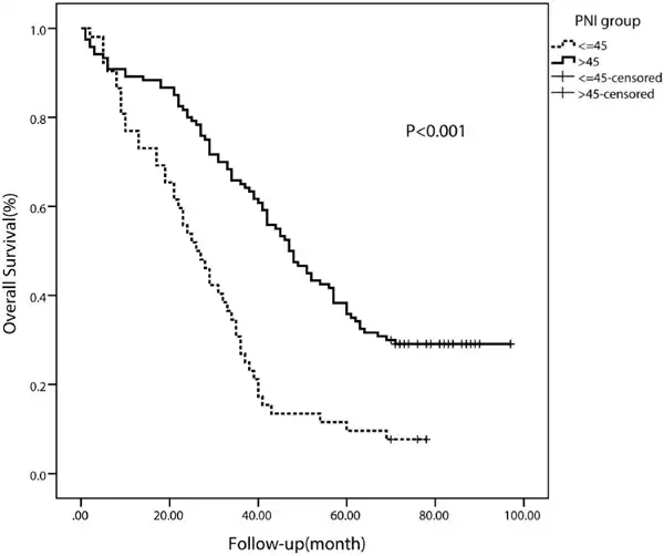 The median PFS in the whole study population was 19 months. The median PFS of patients with a lower PNI (< 45) was 12 months (95% CI 10.62-13.38 months), whereas the median PFS of patients with a higher PNI (≥ 45) was 23 months (95% CI 18.03-27.97 months). The PFS rate was significantly worse in the low-PNI group than in the high-PNI group (p < 0.001) (fig. 2). Moreover, the OS rate was also significantly worse in the low-PNI group (p < 0.001) (fig. 3).