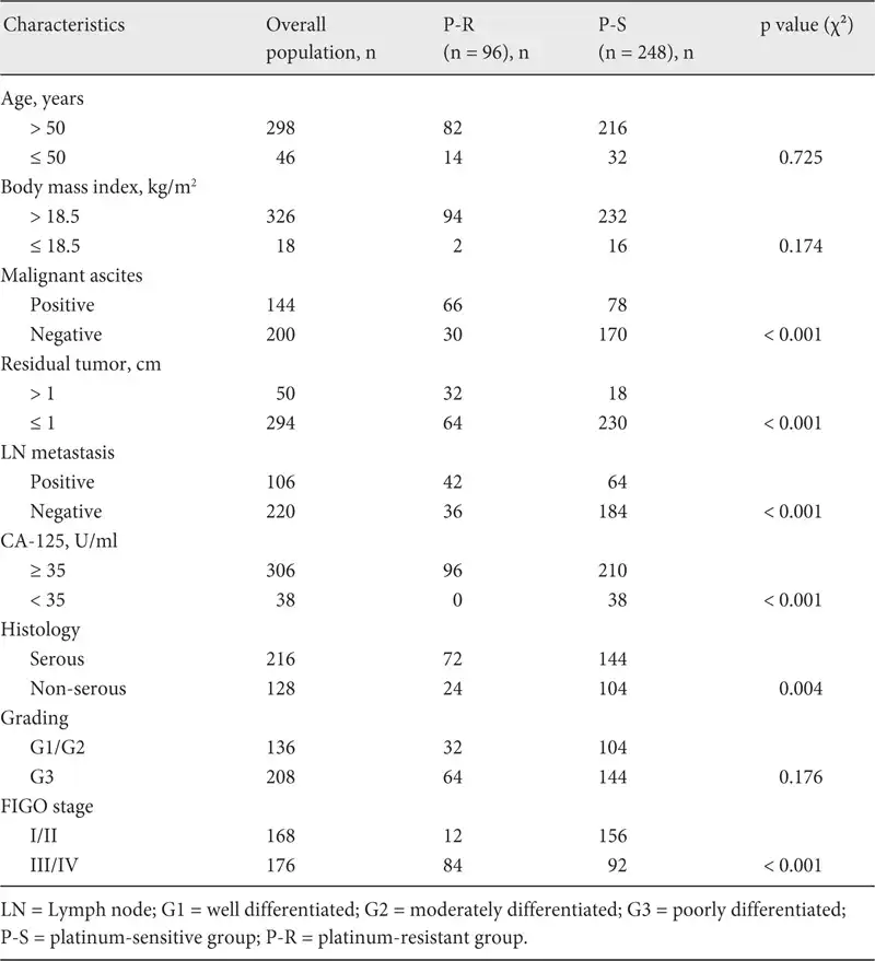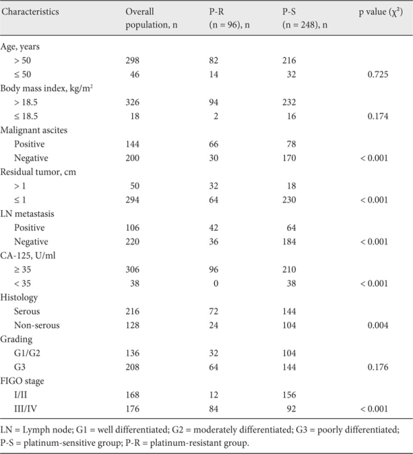 Patients were divided into 2 groups in accordance with the length of the progression-free interval. Patients with disease progression within 6 months of completion of first-line platinum-based chemotherapy were defined as the platinum-resistant group (P-R group), while all others were defined as the platinum-sensitive group (P-S group). Differences in clinical features and prognosis were compared between the 2 groups.