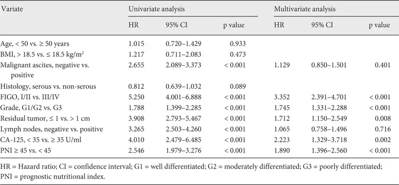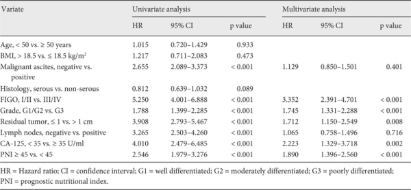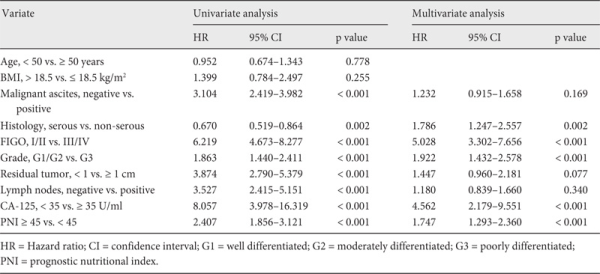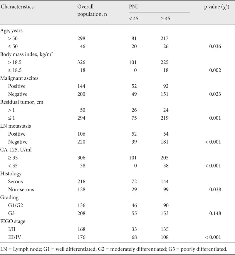 In order to assess the independent prognostic factors, we utilized multivariate Cox proportional hazards analysis as a control for other prognostic values. All patients (n = 344) were evaluated in univariate analysis. Malignant ascites, advanced FIGO stage, high grade, residual tumor, lymph node metastasis, CA-125 ≥ 35 U/ml, and PNI < 45 were found to be associated with PFS (table 3). In addition, a multivariate analysis indicated that advanced FIGO stage (hazard ratio (HR) 3.352, 95% CI 2.391-4.701; p < 0.001), poor differentiation (HR 1.745; 95% CI 1.331-2.288; p < 0.001), CA-125 ≥ 35 U/ml (HR 2.223, 95% CI 1.329-3.718; p = 0.002), residual tumor (HR 1.712, 95% CI 1.150-2.549; p = 0.008), and PNI < 45 (HR 1.890, 95% CI 1.396-2.560; p < 0.001) were poor prognostic factors for PFS. The correlations between OS and various clinicopathological factors are shown in table 4. According to multivariate analysis, preoperative PNI < 45 was an independent risk factor for poor OS (HR 1.747, 95% CI 1.293-2.360; p < 0.001).