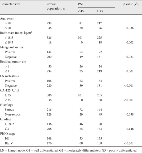 The nutritional and immunological status before surgery plays an indispensable role in the occurrence of postoperative complications and for OS rates of patient with malignant tumors [,]. The prognostic nutritional index (PNI), which can be calculated based on the serum albumin concentration and peripheral blood lymphocyte count, was originally proposed by Onodera et al. [ ]to evaluate the nutritional and immunological status of patients who undergo gastrointestinal surgery. The index has attracted a lot of interest as a novel prognostic marker in various cancers including renal cell carcinoma, colorectal cancer, hepatocellular carcinoma, pancreatic cancer, and gastric carcinoma [,,,,]. However, to our knowledge, evidence for the use of PNI as a direct predictor of chemotherapy outcome in patients with EOC is still lacking. Therefore, we retrospectively studied the relationship between PNI and clinicopathological characteristics of EOC patients who were treated with platinum-based chemotherapy, in an attempt to determine whether the preoperative PNI can be used as a marker for predicting chemotherapy response and survival outcome in patients with EOC.