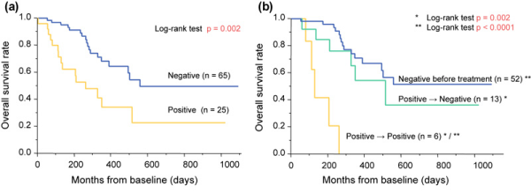 Overall survival in 90 patients with esophageal squamous cell carcinoma (ESCC). circulating tumor cell (CTC) detection was carried out pre-therapeutically (n = 90) and after treatment (n = 71). From [].