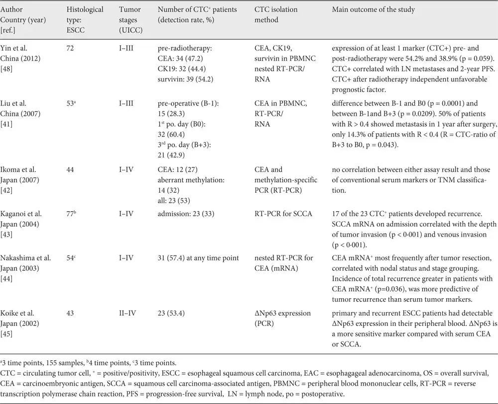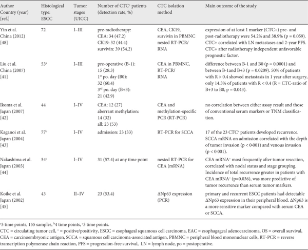 Compared to other solid tumor entities, only few studies have explored the meaning of CTC for progression and prognosis in EC. Investigations performed in the first decade of this century, which were mainly carried out in Asian EC patients, used nucleic-acid based CTC detection by RT-PCR. These studies revealed varying CTC detection rates ranging from 2 to 57% in patients with ESCC subtype (table 2). The relatively broad range may be explained by inconsistent definition of positive CTC status in RT-PCR, different nucleic acid-extraction protocols and the utilization of different molecular markers. A recent meta-analysis examined 13 eligible studies with a total of 979 ESCC patients. In this meta-analysis, 11 of the 13 studies (821 of 979 patients) used RT-PCR for CTC detection. The meta-analysis revealed positive CTC in patients' blood to be associated with both worse progression-free/disease-free survival (PFS/DFS) with a hazard ratio (HR) of 2.32 (95% confidence interval (CI) 1.57-3.43, p < 0.001) and poorer OS with an HR of 2.64 (95% CI 1.69-4.14, p < 0.001) [].