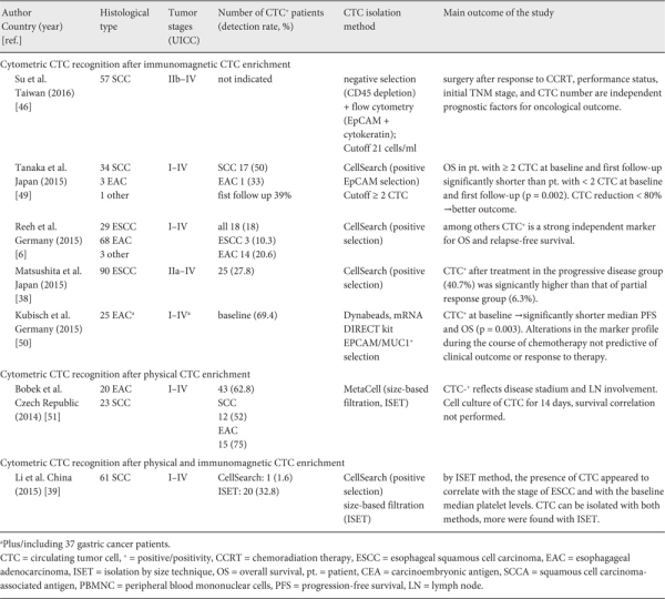 Recent technical advancements in both CTC enrichment and detection methods have been centered on cytometric-based CTC detection assays rather than nucleic acid-based CTC detection methods, not only in EC but also in many other solid cancer entities. In 2014, a first pilot study on immunomagnetic CTC detection with the FDA-approved CellSearch® platform in 18 patients with either metastasized gastric cancer or EC showed ≥ 2 CTC/7.5 ml blood (EpCAM+/CK+/CD45-) in 8 of the patients []. After systemic chemotherapy, the tumor response rate was 60% versus 38% in patients with < 2 CTC/7.5 ml blood versus ≥ 2 CTC/7.5 ml blood. Median PFS and OS were 6.1/10.5 months in the groups of patients with < 2 CTC and 5.2/6.1 months in those with ≥ 2 CTC.