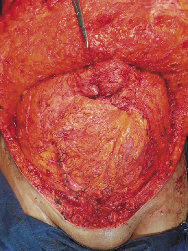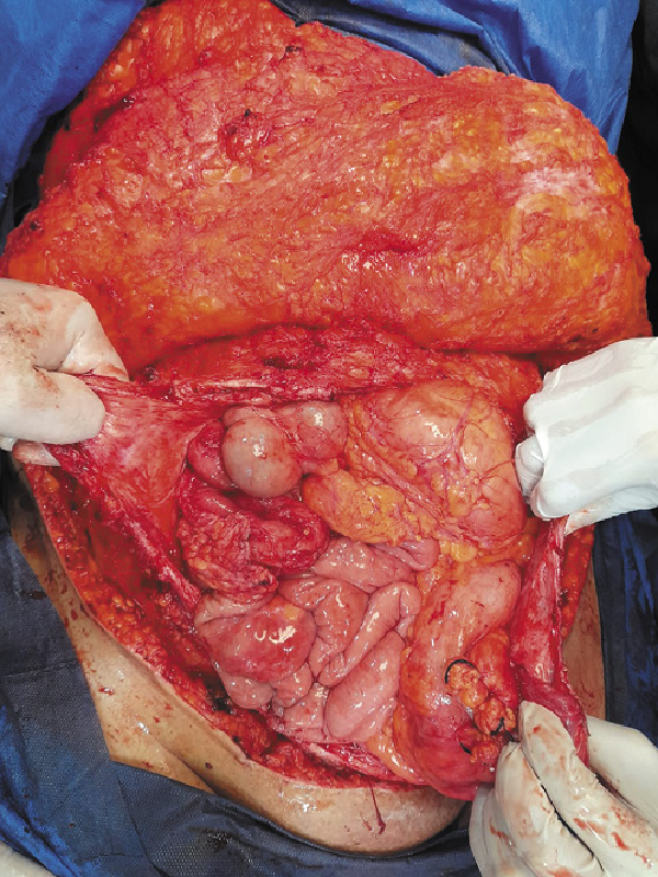 The abdominal wall defects created after tumor resection were of myofascial type. The high BMI of our patients with redundant abdomen facilitated the approximation of the edges of the defects. However, in patients with small-sized tumors, the defects were closed without any significant tension. Approximation of the defect edges was done by mobilization of the abdominal wall muscles from the subcutaneous tissue (Fig. 1), then the greater omentum was mobilized and dissected to have a long vascularized omental flap. The omental flap was sutured meticulously to the defect edge using Vicryl sutures (Fig. 2). A synthetic PP mesh was then inserted, and the mesh size varies according to the defect size in every case. A bridged repair with mesh placement in the pro-rectus planes was done, after achieving the maximal advancement of the defect (Fig. 3). We did not utilize in this study any antiadhesive meshes or biologic meshes. The meshes were sutured to the edges of the defect using Prolene sutures. A subcutaneous suction drain (Redivac, 18 Fr) was inserted for drainage of any serous fluid formed after mesh application and an intra-abdominal drain was inserted in cases with bowel resection.