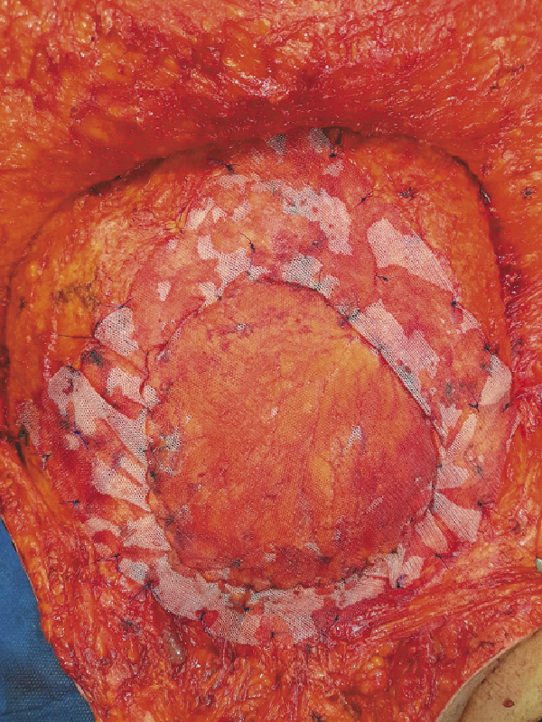 CST (Ramirez technique) was used for primary closure of the midline defects through mobilization of the abdominal wall muscles medially []. It is a commonly used procedure that allows closure of the midline defects successfully in 80% of the cases. It was combined with biologic mesh placement in a study that included 80 patients with abdominal hernia and has improved the hernia recurrence rate []. However, CST is associated with wound complications due to creation of large subcutaneous space, which accumulate fluid and potentially cause devascularization of the skin flaps which lead to skin loss [].