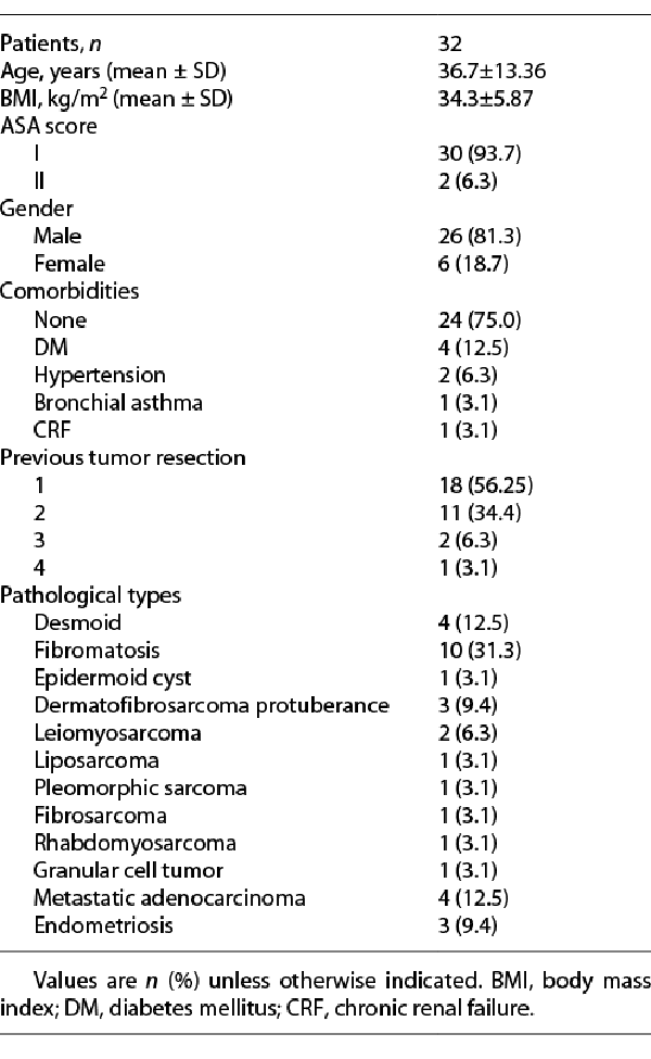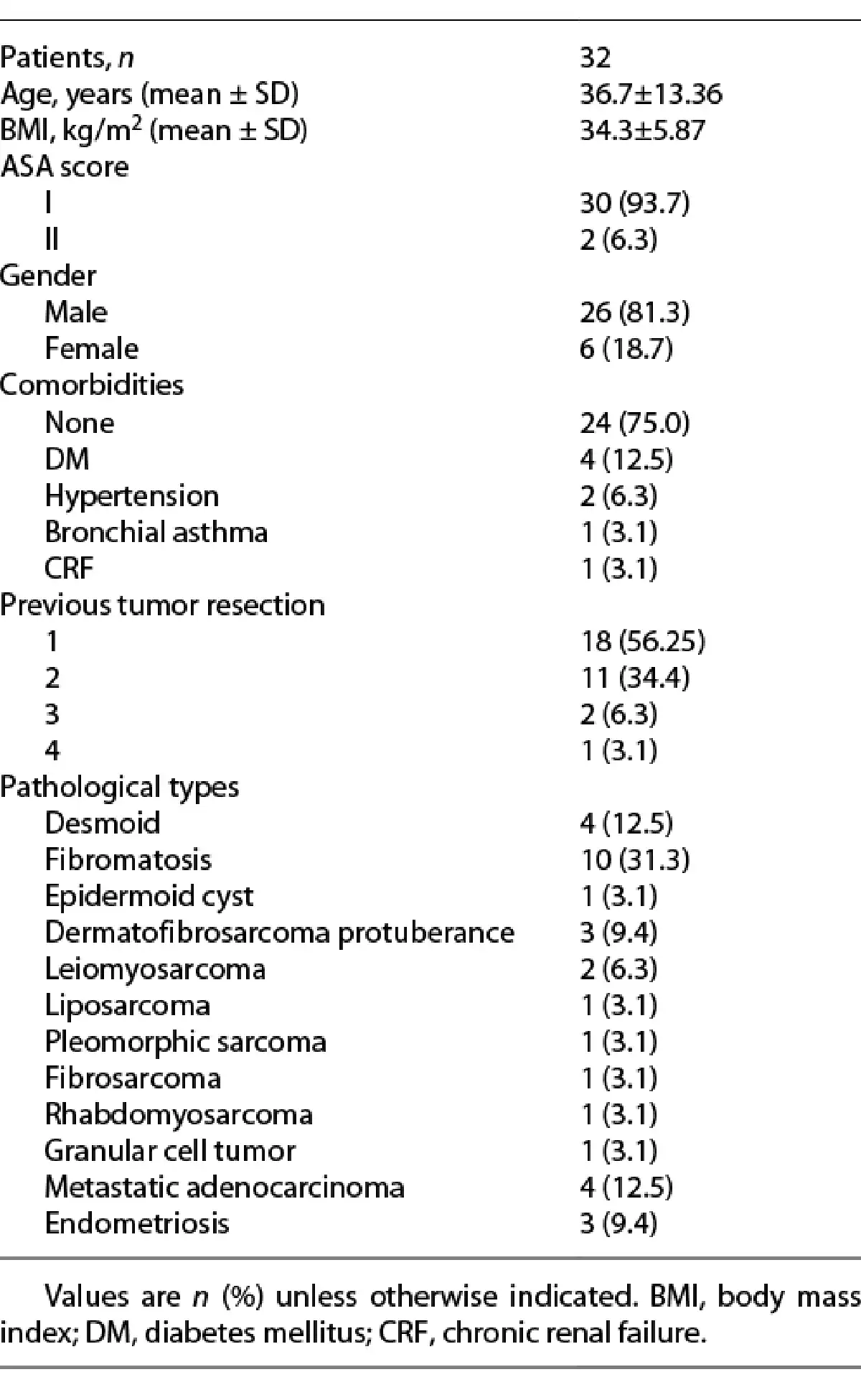 Between July 2016 and February 2021, 32 patients with abdominal wall neoplasms underwent resection in our center and the defects were closed with an omental flap and synthetic PP mesh. The mean age of the patients in this study was 36.7 ± 13.36 years. Most of the cases were males (81.3%). The BMI was 34.3 ± 5.87 kg/cm2. In addition, most of the patients (93.7%) had an ASA score I (according to the American Society of Anesthesiologists). Pathological findings of the resected tumors are reported in Table 1. Regarding the previous tumor resection, 18 cases had one previous resection, 11 cases had two previous resections, 2 cases had three previous resections, and only 1 case of dermatofibrosarcoma protuberance had a history of 4 previous resections.