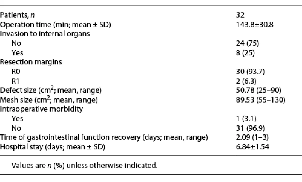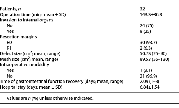 The surgical characteristics are shown in Table 2, the mean operative time was 143.8 ± 30.8 min. We reported 8 cases with intra-abdominal extension, small intestinal resections were done for four of them (2 cases with fibromatosis, 1 case with leiomyosarcoma, and another case with pleomorphic sarcoma), 1 patient with fibromatosis had nephrectomy of a transplanted kidney, and another patient with colonic adenocarcinoma was invading the anterior abdominal wall. Two patients with (liposarcoma and leiomyosarcoma) had incomplete (R1) resection due to infiltration of vital intra-abdominal organs, while complete (R0) resection was achieved for the rest of the 30 patients. The mean size of the abdominal wall defect was 50.8 cm2 (range: 25–90 cm2) and the meshes used in reconstruction had a mean size of 89.5 cm2 (range: 55–130 cm2). Nephrectomy of the transplanted kidney was the only intraoperative morbidity reported.