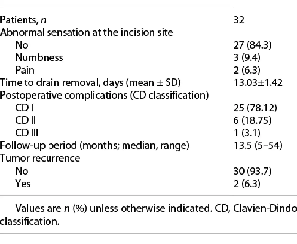 Seroma is considered a common complication with mesh reinforcement after abdominal wall tumor resection due to foreign body reaction to the synthetic mesh and large subcutaneous space formation []. Only 2 cases (6.25%) in our study have developed mild seroma that was treated conservatively as the suction drains were removed within 13 days postoperatively to give enough time for drainage of any serous fluid accumulation. The rate of seroma formation after incisional hernia repairs with mesh was 21% despite the postoperative drainage [].