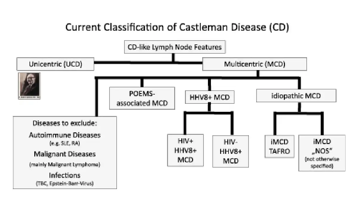The term Castleman disease (CD) describes a spectrum of rare disorders with characteristic histopathological features. Unicentric CD (UCD) is a benign, local hyperplasia of lymphoid tissue that was first described in 1954 by the US pathologist Benjamin Castleman as a mediastinally localized hyperplasia of lymphoid tissue []. The multicentric form (MCD) was first described in 1985 [] and may occur as a potentially life-threatening systemic disease. The complex symptomatology is mostly due to an overproduction of interleukin-6 (IL-6) or dysregulation of IL-6-related signaling pathways. From a therapeutic perspective, it is important to subdivide the so-called idiopathic MCD (iMCD) from cases that are associated with the human herpes virus 8 (HHV-8 + MCD) and/or the human immunodeficiency virus (HIV). However, iMCD is not a homogeneous entity. The clinically distinct variants and the current classification of CD are depicted in Figure 1. During recent years, international consensus guidelines for diagnosis and treatment have been developed for UCD and iMCD [-]. We herein summarize recent advances in diagnostic, treatment, and novel insights into the pathogenesis of this disease.