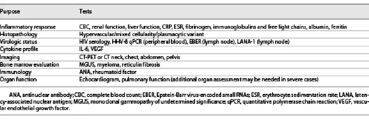 Histopathologic examination of an extirpated lymph node is mandatory for definitive diagnosis of CD; a biopsy is usually not sufficient. Diagnostic guidelines are available for both UCD and iMCD [, ]. Imaging (computed tomography scans of the neck, thorax, and abdomen/pelvis or PET-CT) as well as laboratory tests are necessary to differentiate UCD from MCD []. A recommended diagnostic workup for MCD is shown in Table 1.