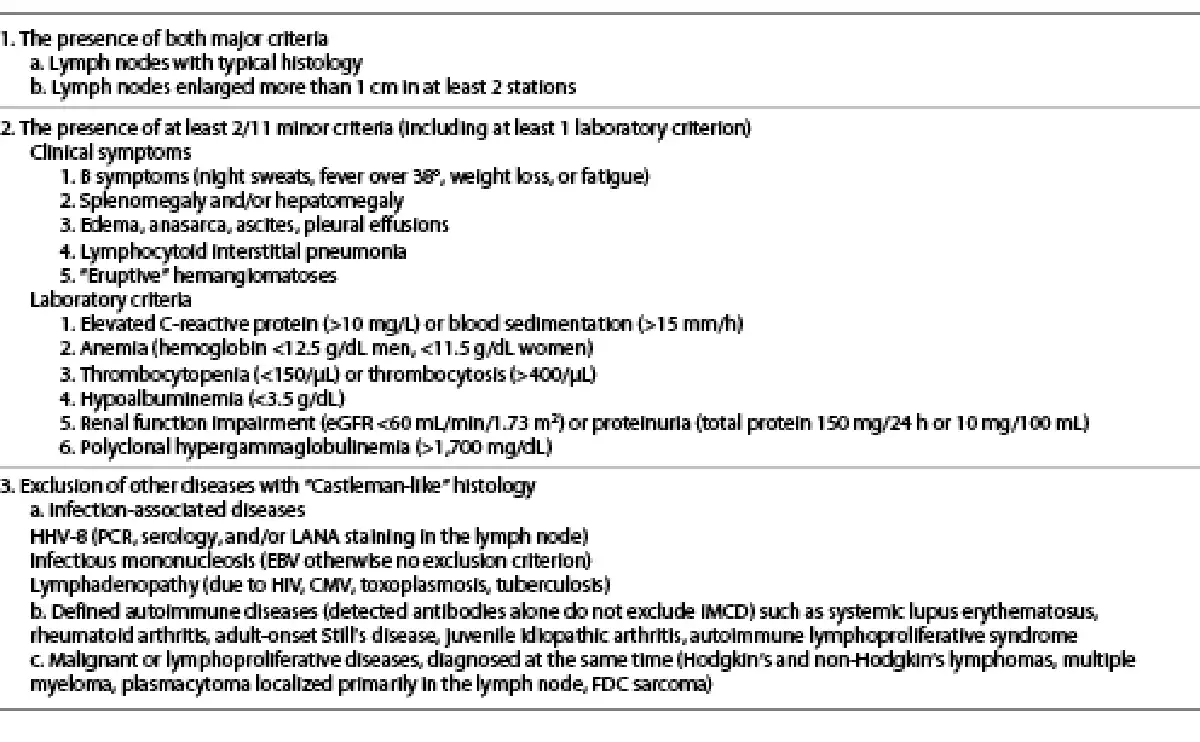 For iMCD, consensus diagnostic criteria were defined for the first time in 2017 []. They are shown in Table 2 and include, in addition to definite lymph node changes, at least 2 of 11 clinical or laboratory “minor” criteria. Of note, numerous other diseases must be excluded whose lymph node histology may show “Castleman-like” features []. These diseases not only include, among others, autoimmune diseases such as lupus erythematodes or rheumatic diseases and sarcoidosis but also malignant lymphomas and infections such as EBV, HIV, and tuberculosis. In some cases, a clear differentiation may be impossible. In particular, the differentiation from IgG4-related disease is challenging since Ig4 elevations also occur in iMCD and numerous clinical parallels can be seen [, ]. CD should also always be considered in the differential diagnosis of hemophagocytic lymphohistiocytosis and other inflammatory syndromes.