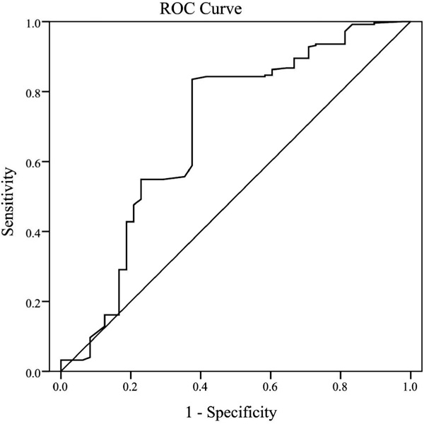 Features such as malignant ascites, residual tumor, lymph node metastasis, preoperative CA-125 value, histology, grading, and FIGO stage were found to be related to response to chemotherapy in EOC patients. The respective mean levels of serum albumin and peripheral lymphocyte count were 41.04 ± 4.53 g/dl and 1.73 ± 0.49/mm3 in the P-S group, and 38.95 ± 4.83 g/dl and 1.45 ± 0.37/mm3 in the P-R group. The mean levels of PNI were 49.70 ± 5.35 in the P-S group and 46.19 ± 6.21 in the P-R group. PNI levels were significantly different between the 2 groups (p < 0.001). Correlations were further observed between the preoperative PNI and clinicopathological factors. The PNI level was significantly associated with age, BMI, residual tumor, lymph node metastasis, CA-125, histology, and FIGO stage (p = 0.036, 0.002, 0.001, < 0.001, < 0.001, 0.038, and < 0.001, respectively) (table 2). ROC curves for platinum-based chemotherapy outcome prediction were plotted to verify the optimum cut-off point for PNI. AUC, sensitivity, specificity, positive and negative predictive values, and accuracy of PNI < 45 to predict platinum resistance were: 0.688, 62.50%, 83.47%, 59.41%, 85.19%, and 77.62%, respectively (fig. 1).