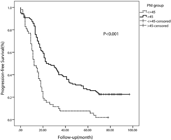 Kaplan-Meier curve for progression-free survival regarding low versus high prognostic nutritional index (PNI) (p < 0.001).