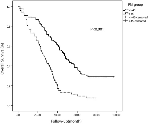 The median PFS in the whole study population was 19 months. The median PFS of patients with a lower PNI (< 45) was 12 months (95% CI 10.62-13.38 months), whereas the median PFS of patients with a higher PNI (≥ 45) was 23 months (95% CI 18.03-27.97 months). The PFS rate was significantly worse in the low-PNI group than in the high-PNI group (p < 0.001) (fig. 2). Moreover, the OS rate was also significantly worse in the low-PNI group (p < 0.001) (fig. 3).