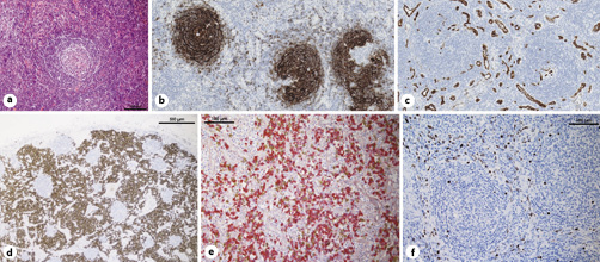 a iMCD (H&E staining, ×200 magnification). Regressed germinal center (GC) with characteristic “lollipop” phenomenon of radially penetrating blood vessels and “onion skinning” created by expanded mantle zones with concentrically arranged lymphocytes around the regressed GC. b iMCD, another patient (CD23 antibody, immunohistochemistry, ×200 magnification). Vascular thickening in the germinal centers. Again, onion-like layers of the FDCs in the germinal center. c iMCD (CD34 antibody, immunohistochemistry, ×100 magnification). Significant increase in high endothelial venules with the interfollicular area (possibly VEGF-induced). d, e Plasmacytic (PC) variant of iMCD with polyclonal plasmacytosis, demonstrated by immunohistochemistry for CD138 (×50 magnification, left) and double staining for kappa and lambda light chains (×200 magnification, right, kappa: red, lambda: brown). f HHV-8 + MCD (×200 magnification). Nuclear immunostaining for LANA-1 antigen in small lymphocytes in the lymph node. Note the regressed GC with “onion skinning” of the mantle zone.
