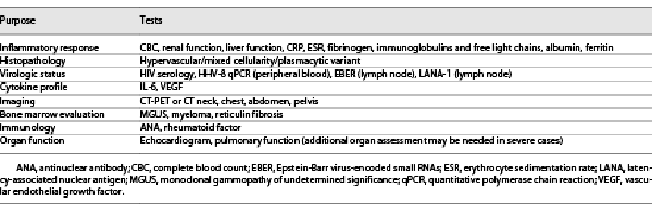 Histopathologic examination of an extirpated lymph node is mandatory for definitive diagnosis of CD; a biopsy is usually not sufficient. Diagnostic guidelines are available for both UCD and iMCD [, ]. Imaging (computed tomography scans of the neck, thorax, and abdomen/pelvis or PET-CT) as well as laboratory tests are necessary to differentiate UCD from MCD []. A recommended diagnostic workup for MCD is shown in Table 1.