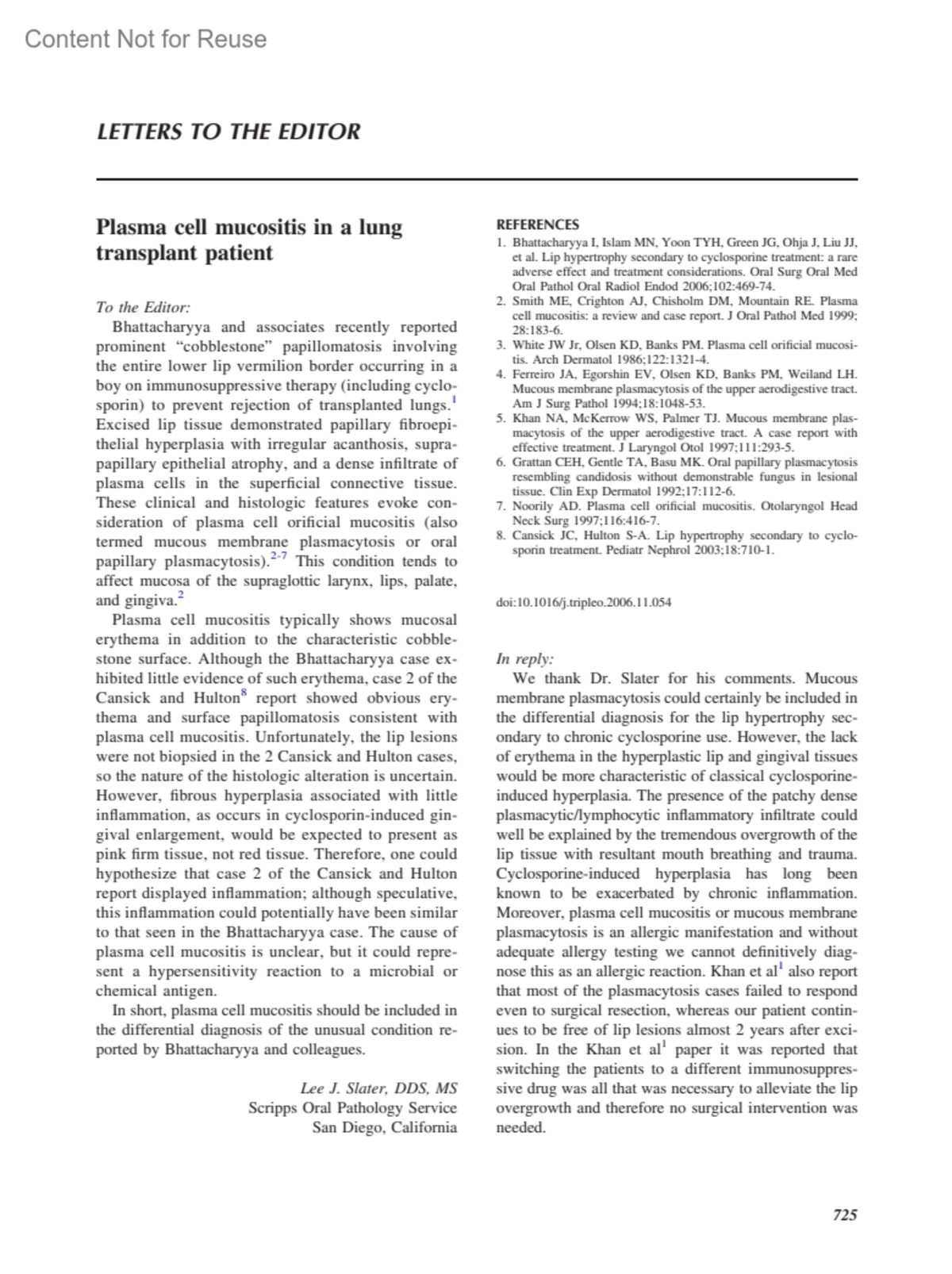 Oral Surgery, Oral Medicine, Oral Pathology, Oral Radiology, & Endodontics 103(6):p 725-726, June 2007.