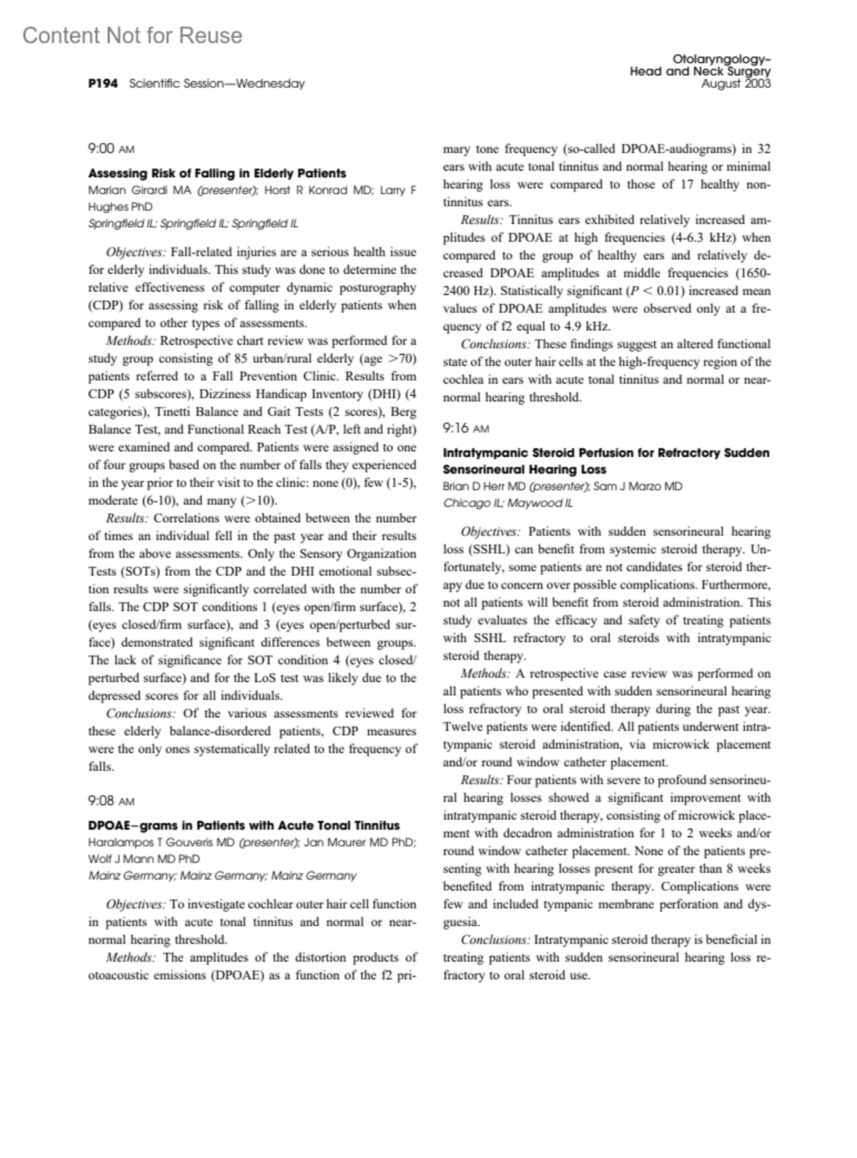 Intratympanic steroid perfusion for refractory sudden sensorineural hearing lossHerr, Brian D. MDMarzo, Sam J. MDAuthor informationaChicago IL, USAbMaywood IL, USApresenterOtolaryngology - Head & Neck Surgery 129(2):p 194, August 2003. | DOI: 10.1016/S0194-5998(03)01229-4Copyright © 2003 by Mosby, Inc