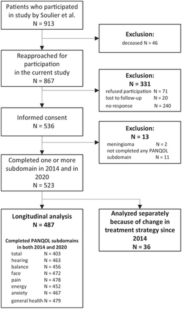 Flowchart of study participants. The number of patients who completed the Penn Acoustic Neuroma Quality of Life (PANQOL) questionnaire both in 2014 and 2020 are shown in the last box per subdomain.