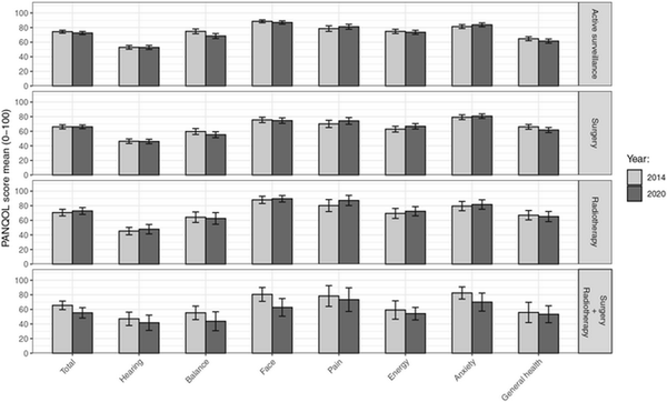 Paired unadjusted mean Penn Acoustic Neuroma Quality of Life (PANQOL) scores 2014 and 2020 per treatment modality. Error bars indicate 95% CIs of the means. Higher scores indicate better quality of life. The total score is the arithmetic mean of the subdomains.