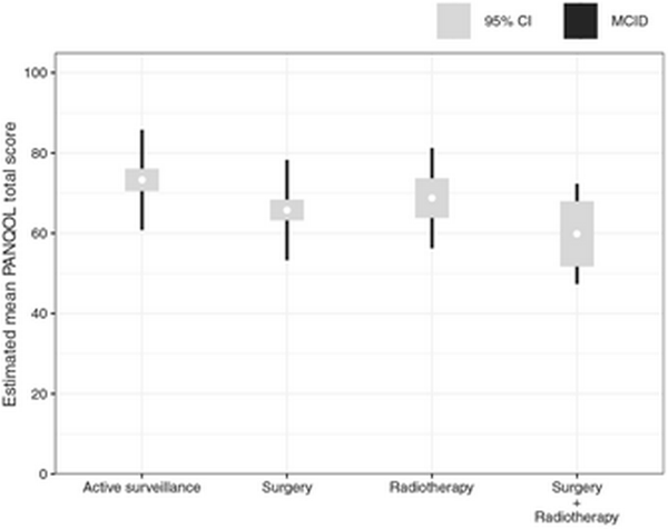 Total PANQOL scores in the surgery (–7.5; 95% CI, –11.2 to –3.8) and surgery + radiotherapy (–13.5; 95% CI, –22.1 to –4.8) groups were lower than the active surveillance group. The difference with the group receiving both surgery and radiotherapy exceeded the 12.5‐point MCID. When analyzing the separate subdomains, differences were found for balance after surgery (–14.8) and radiotherapy (–15.4), exceeding the MCID of 14. Differences in anxiety in the radiotherapy group (–18) exceeded the MCID (13).
