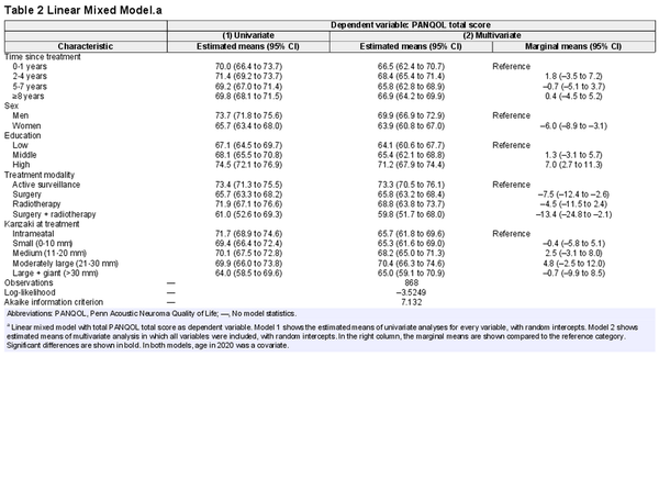 Long‐term effects of time since treatment and treatment modality on QoL were analyzed using a linear mixed model (R‐package nlme) to account for repeated measurement data. Model assumptions were visually checked. The total PANQOL score was the dependent variable, with 2 measurements per patient (2014 and 2020). Covariates such as age, education level, sex, and tumor size were stepwise included in the model, and model selection was based on the Akaike information criterion, as were interactions between time since treatment and other covariates. In the final model, random intercepts were used with fixed variables. All tests were 2‐sided and P values <.05 were considered statistically significant. Patients treated (by surgery, radiotherapy, or both) after 2014 (ie, between the 2 measurements) were analyzed separately. Because of the small sample size, no further statistical analysis was performed on these data.