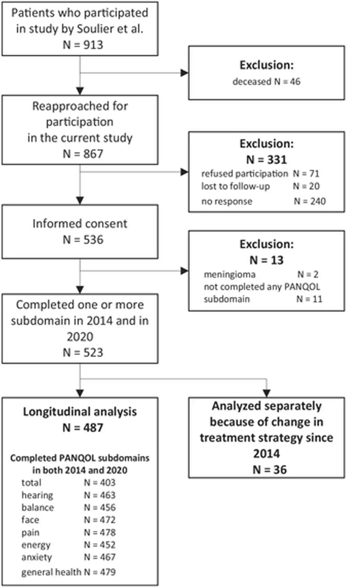 Flowchart of study participants. The number of patients who completed the Penn Acoustic Neuroma Quality of Life (PANQOL) questionnaire both in 2014 and 2020 are shown in the last box per subdomain.