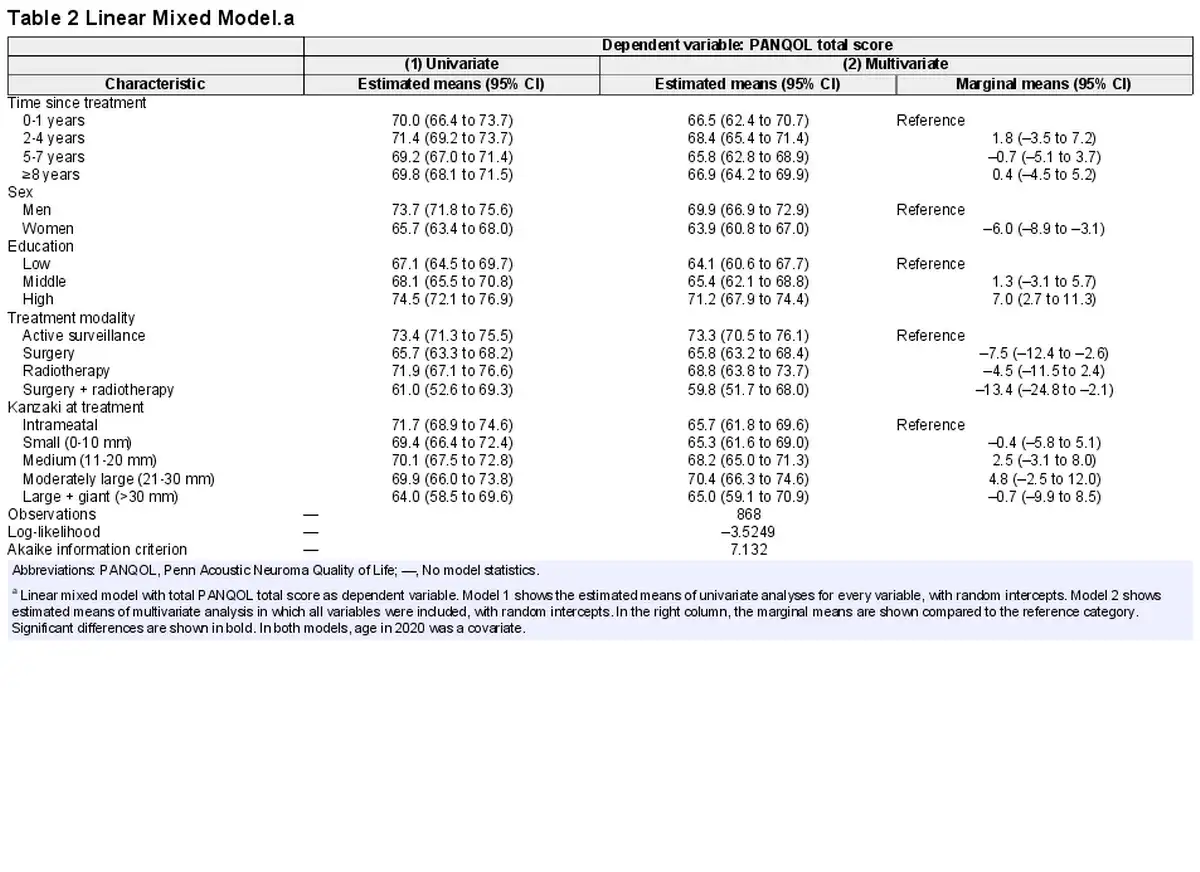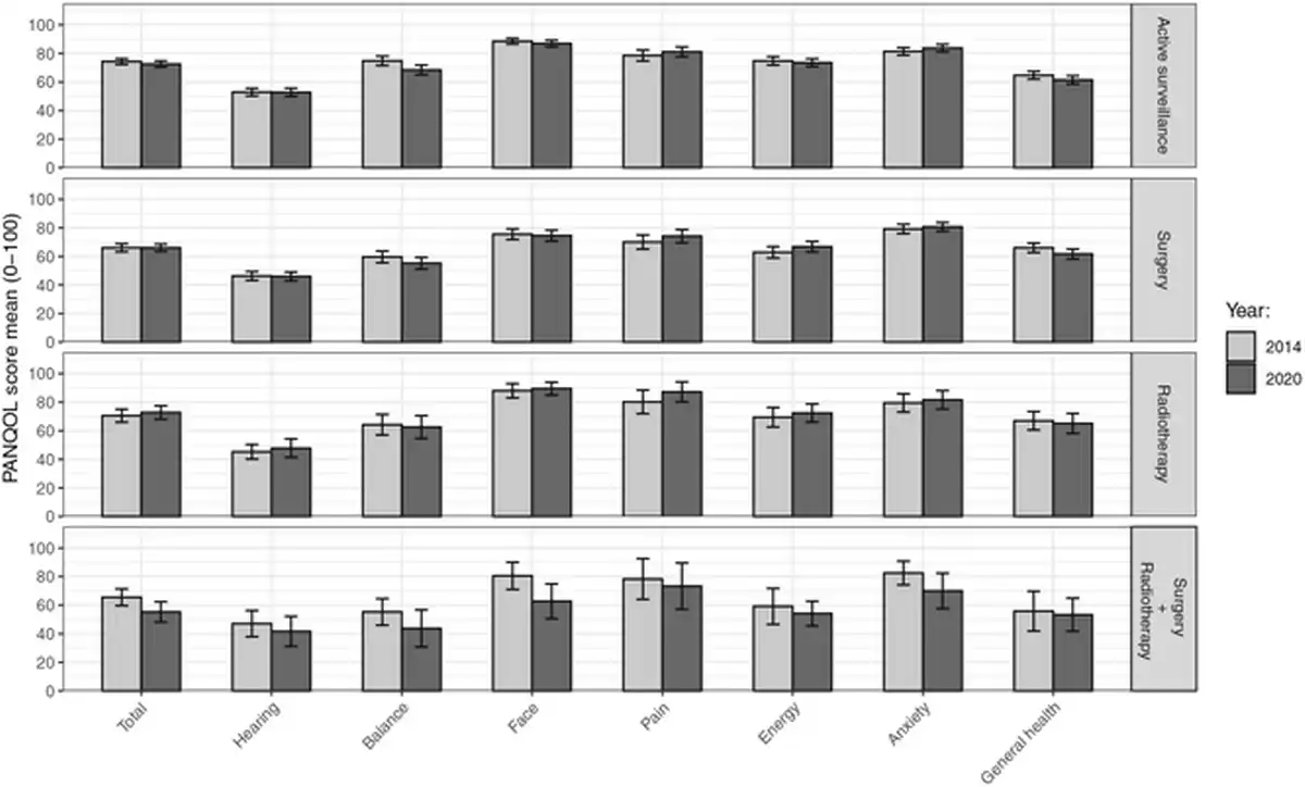 In 2010, Shaffer et al developed the Penn Acoustic Neuroma Quality of Life (PANQOL) questionnaire. This disease‐specific questionnaire enabled more accurate QoL measurement than the generic QoL questionnaires.7,, , Several studies have published the results on the QoL of different treatment modalities., , , , Kerezoudis et al have defined the minimal clinically important differences (MCIDs) of PANQOL total and subdomain scores, which advanced the interpretation of changes in PANQOL beyond the level of statistical significance.
