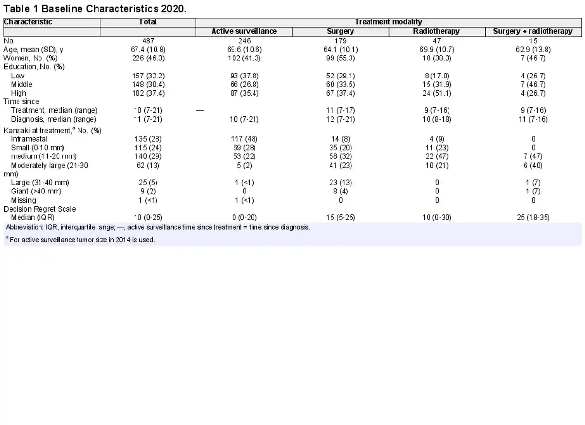 Tumor size, treatment modality, time since diagnosis, and treatment were retrospectively acquired from patient records. Treatment modality was categorized as active surveillance, surgery, radiotherapy, or both surgery and radiotherapy. At our center, multimodal therapy is performed only if the first modality (either surgery or radiotherapy) fails (ie, as salvage treatment). Patients in whom radiotherapy failed underwent salvage surgery and vice versa. Tumor size was scored at the start of treatment or in the case of active surveillance at the time of the first questionnaire in 2014 using the reporting system proposed by Kanzaki et al. Categories large and giant were merged because of the small number of patients in these categories.