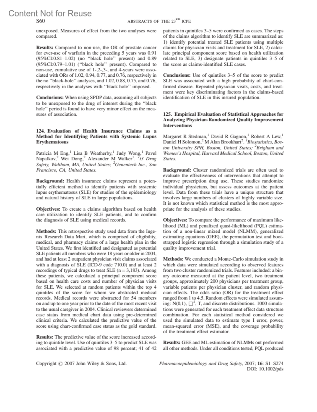 Pharmacoepidemiology and Drug Safety 16:p S60-S61, July 2007.