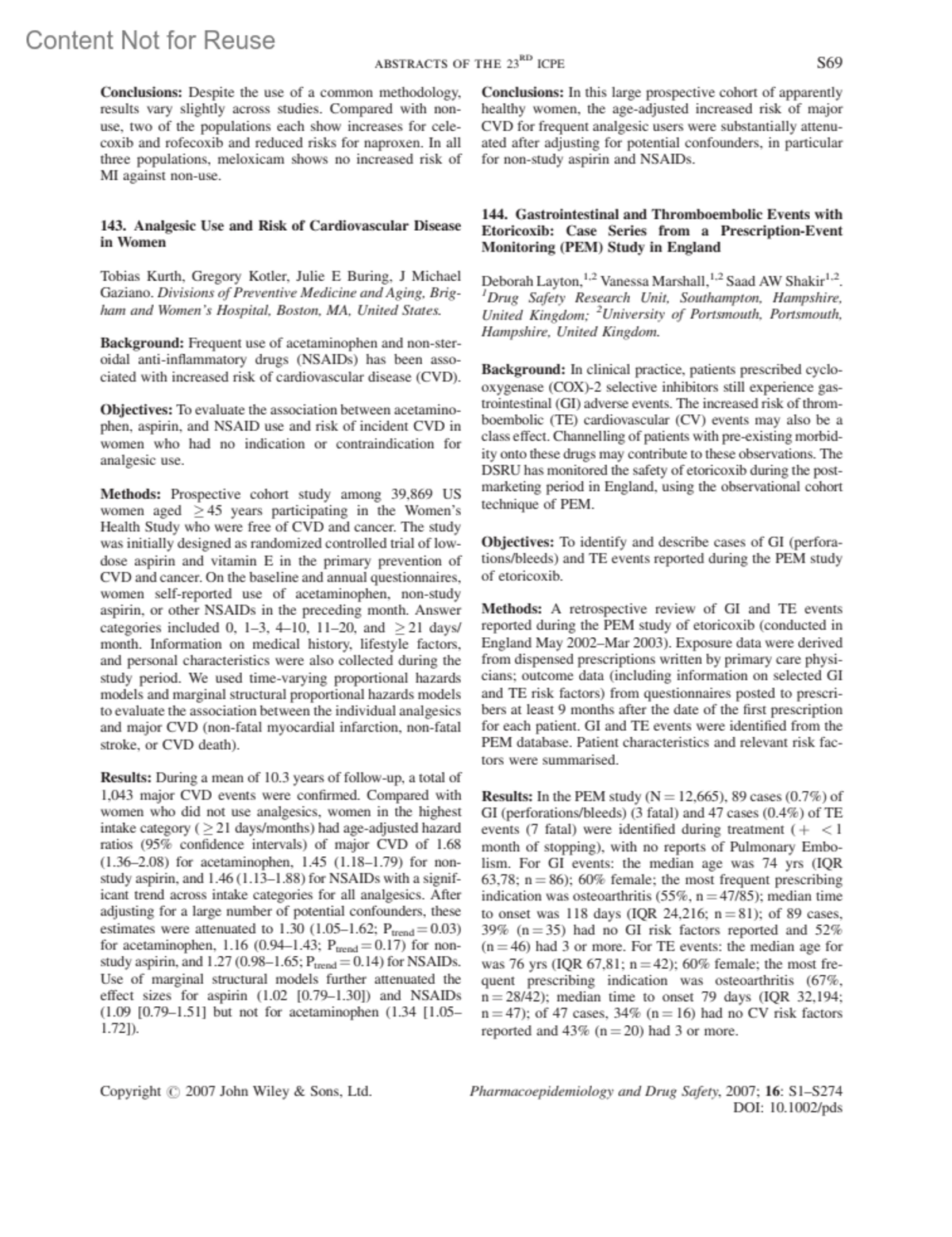 Pharmacoepidemiology and Drug Safety 16:p S69-S70, July 2007.