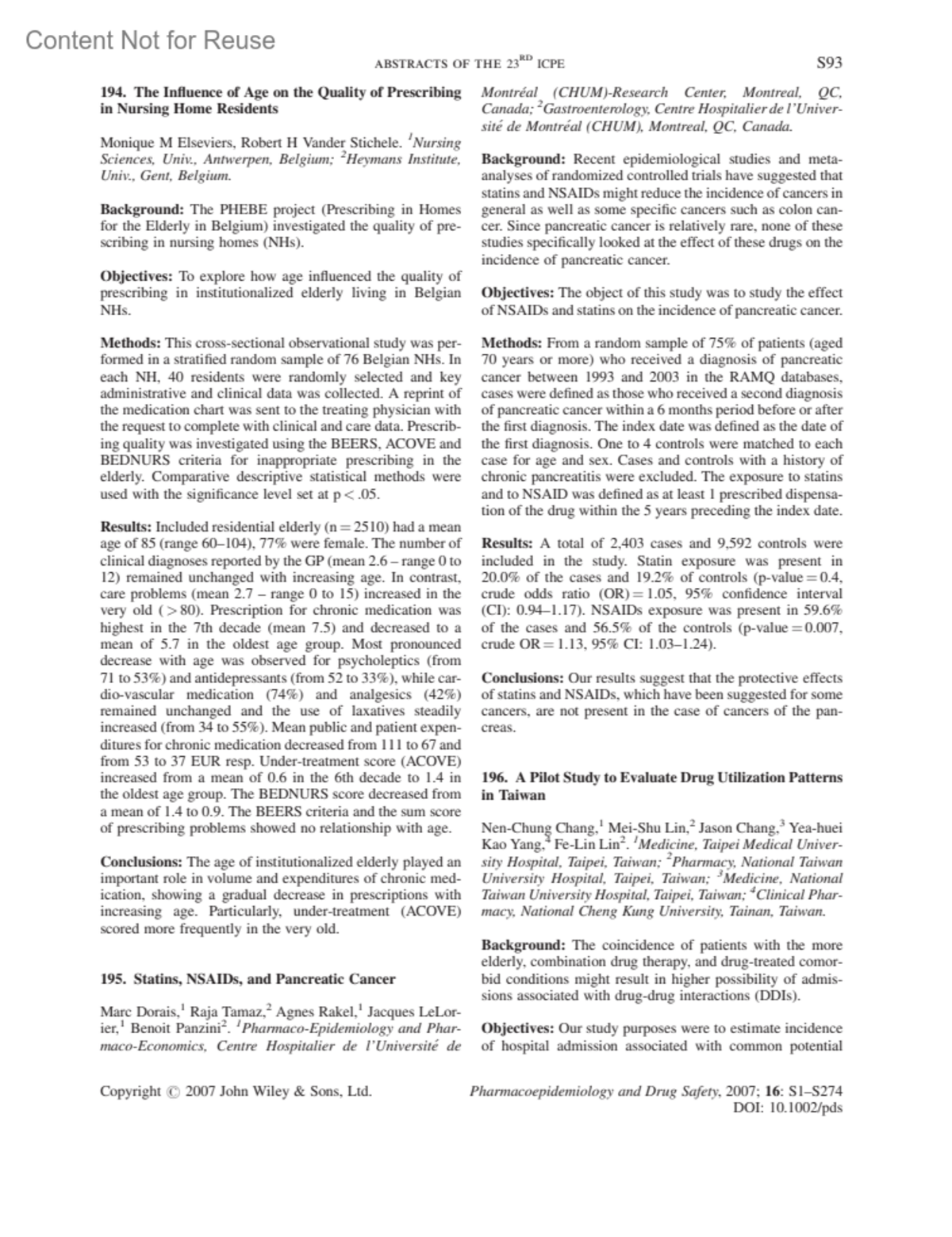 Pharmacoepidemiology and Drug Safety 16:p S93, July 2007.