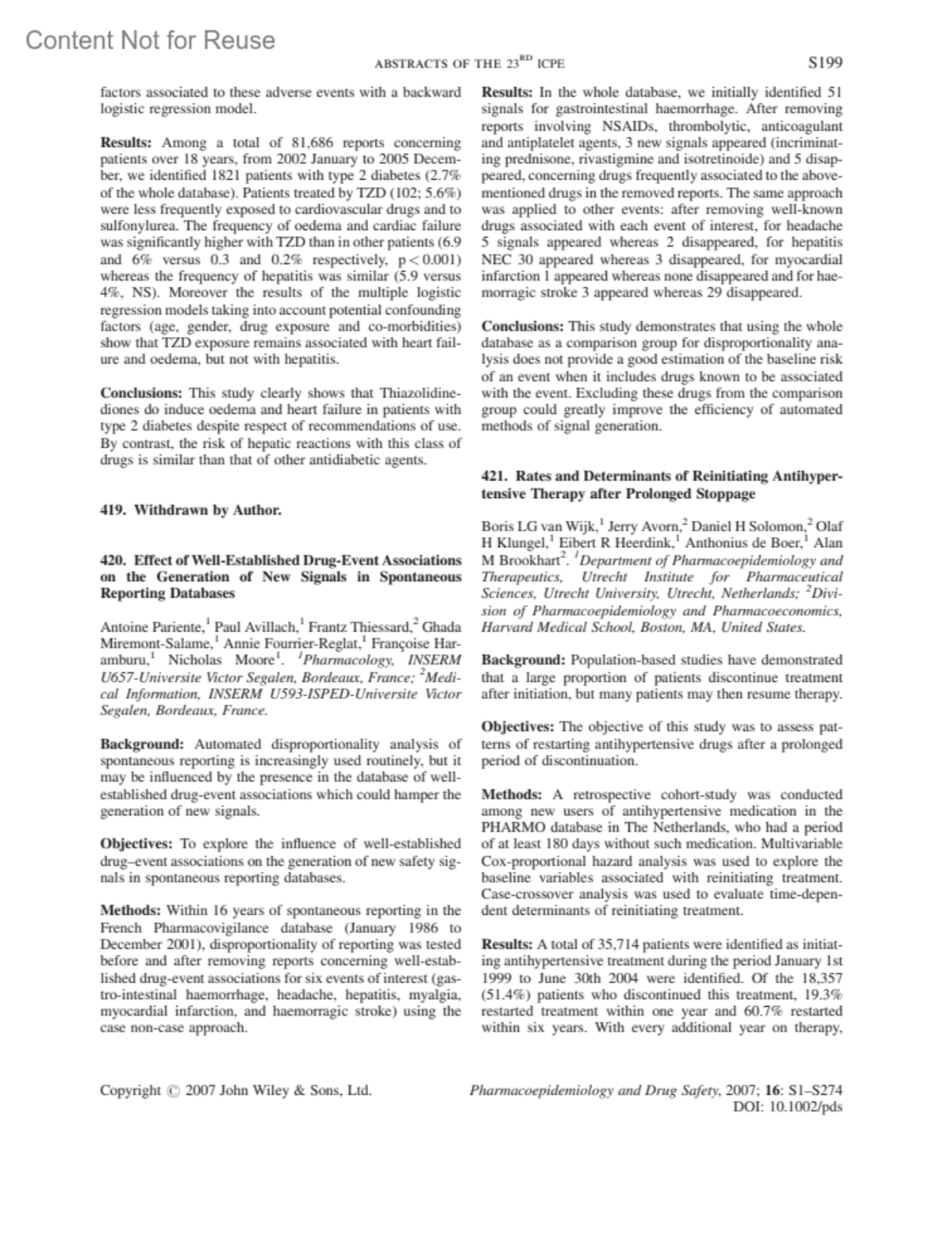 Pharmacoepidemiology and Drug Safety 16:p S199, July 2007.
